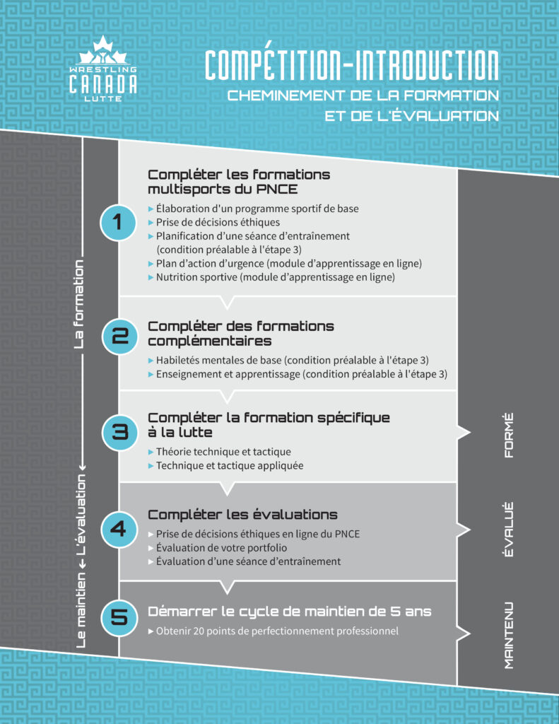 En ce qui concerne le PNCE, les organisations provinciales/territoriales de lutte sont principalement responsables d’assurer l’accès à la formation et à l’évaluation des entraîneurs dans leur province/territoire. Cela peut être réalisé en organisant des activités dans leur province/territoire ou en aidant les entraîneurs à se rendre dans d’autres provinces/territoires pour les opportunités de formation et d’évaluation requises.