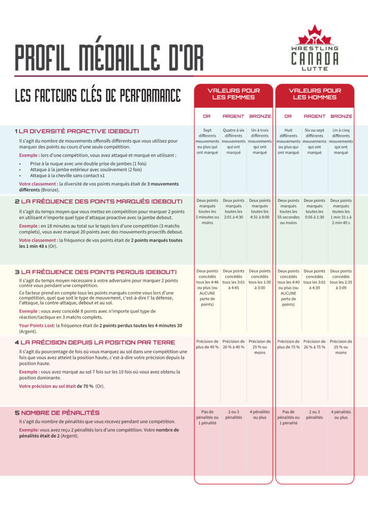 Un profil de médaille d’or décrit l’ensemble des compétences et des attributs qui sous-tendent la performance d’un athlète capable de monter sur le podium des Jeux olympiques, des Jeux paralympiques ou des championnats du monde seniors. Il contient des mesures validées, des repères clairs et est échelonné en fonction du stade de développement.